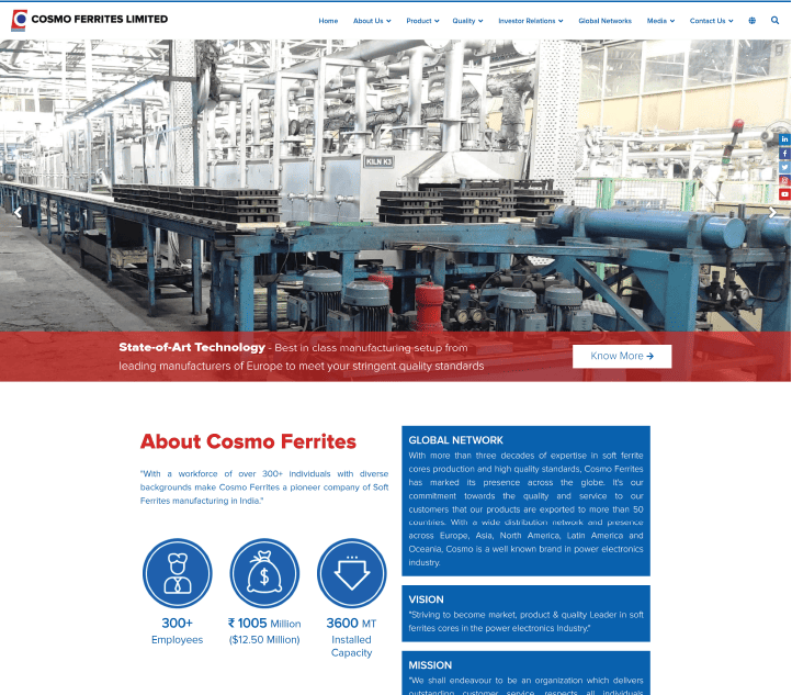 Cosmo Ferrites is one of the leading manufacturers & exporters of soft ferrites. Established in 1986, this Indian based company has production facilities equipped with the best machinery & personnel to deliver innovative, cost-effective & long term solutions to major industries like automotive, solar & lighting.