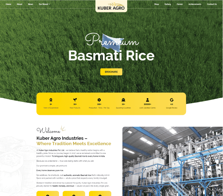 Kuber Agro Industries is based in Sirsa, Haryana. It is a premier manufacturer and exporter of high-quality Basmati and non-Basmati rice, established in 2017. The company uses advanced machinery (including SATAKE and BUHLER) to process rice, offering products such as 1121 Sella and Steam Basmati rice.